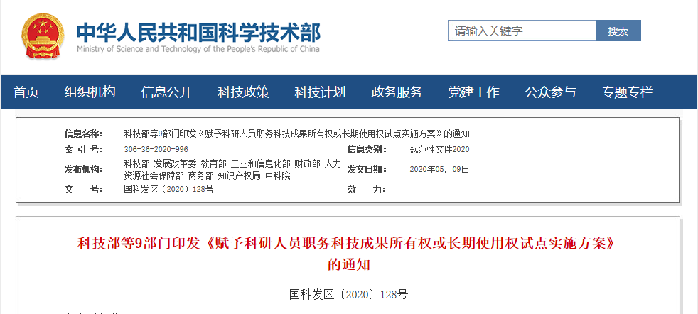 科技部等9部門印發(fā)《賦予科研人員職務(wù)科技成果所有權(quán)或長(zhǎng)期使用權(quán)試點(diǎn)實(shí)施方案》的通知